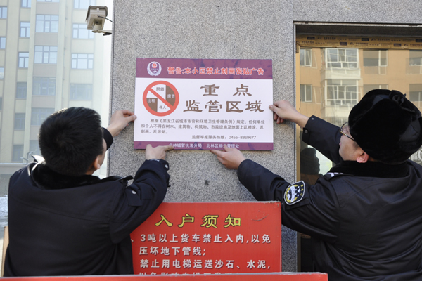 为了让居民和相应行为人了解监督管理情况,北林城管执法分局还特意制作了“重点监管区域”警示牌,悬挂在辖区各居民小区的明显位置,在警示“制乱”者的同时,也方便居民举报和反映情况。活动当天,共清除市区内三个小区近百个单元内各类违法张贴的广告2万余处,悬挂警示牌三块。