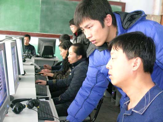 庆安县针对受国际金融危机影响,不少农民放弃了外出打工,想回乡创业的实际情况,努力抓好技能培训,让他们就地创业增加收入。图为返乡农民工正接受计算机培训。