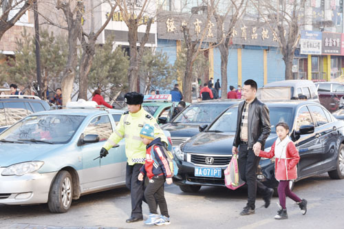 在靖宇小学门前,执勤交警帮助一名上学的孩子穿过车流。