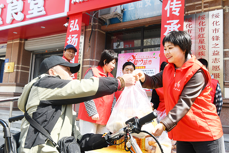 5月5日,绥化市锋之益志愿服务队、北林区雷锋志愿者协会“爱心超市”活动启动。活动中,共为50户弱势群体免费发放米、面、油和鸡蛋等生活物资,并将持续关注弱势群体的生活情况。