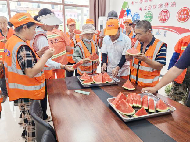 活动现场,工会工作人员早已将准备好的西瓜、矿泉水、冰棍等防暑降温物品摆放整齐。随着户外劳动者们陆续来到工会驿站,工作人员将冰凉的矿泉水递到他们手中,分发清甜的西瓜和爽口的冰棍,让户外劳动者们在炎炎夏日里感受到阵阵凉意。