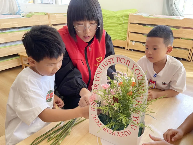 活动现场,社区工作人员早早准备好了各式花材和花盒。孩子们在社区工作人员指导下,兴致勃勃地开启了花艺创作。他们认真挑选喜欢的鲜花,小心翼翼地将花枝插入花泥,仔细调整花枝的高低和角度。尽管动作带着孩童的稚嫩,但每一个步骤都格外用心。经过一番努力,各式各样的插花作品陆续完成。孩子们手捧着亲手制作的花艺作品,兴高采烈地走到老师面前,甜甜地道出:“老师,节日快乐!”老师们接过这份满载童真与爱意的礼物,脸上瞬间绽放出幸福的笑容,整个活动现场被温馨与感动包围。