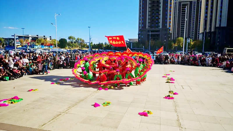 午后,营销中心门前迎来全天高潮——农民秧歌展演火热开演。20支秧歌队、600余名表演者身着红红火火的彩装,头戴绢花、腰系彩绸,手持彩扇、手绢或花伞,踩着震天响的鼓点、伴着欢快的唢呐旋律,迈着“十字步”整齐起舞。有的队伍编排了“丰收喜洋洋”主题造型,队员们手举玉米、稻穗道具,生动再现劳作与丰收场景;有的融入俏皮逗趣的“丑角”表演,夸张的动作引得观众阵阵欢笑;各队还轮番亮出“绝活”,队形时而变换成“五谷丰登”字样,时而围成象征团圆的圆圈,火红的身影在阳光下舞动,将农家丰收的喜悦与对生活的热爱展现得淋漓尽致,吸引数百名市民驻足观看、拍照喝彩,热闹氛围持续至傍晚仍未消减。