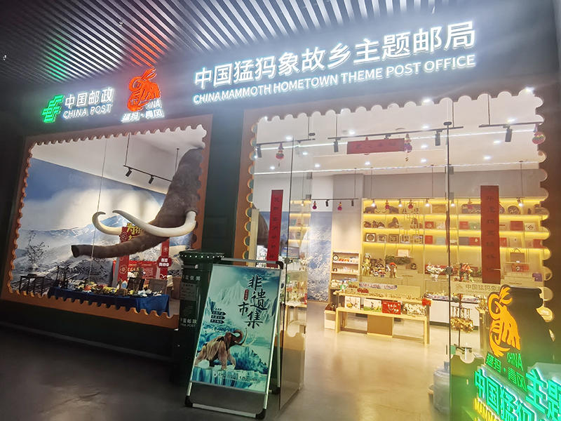 在展馆一层设立的“中国猛犸象故乡主题邮局”,开发了以猛犸象为主题的文创产品,如化石模型摆件、古生物主题文具、科普图书、文化衫、护照、冰箱贴、明信片、文创雪糕等,供游客选购,实现文化价值赋能经济效益。这里,也可以快递出一张来自“中国猛犸象故乡”的明信片。
