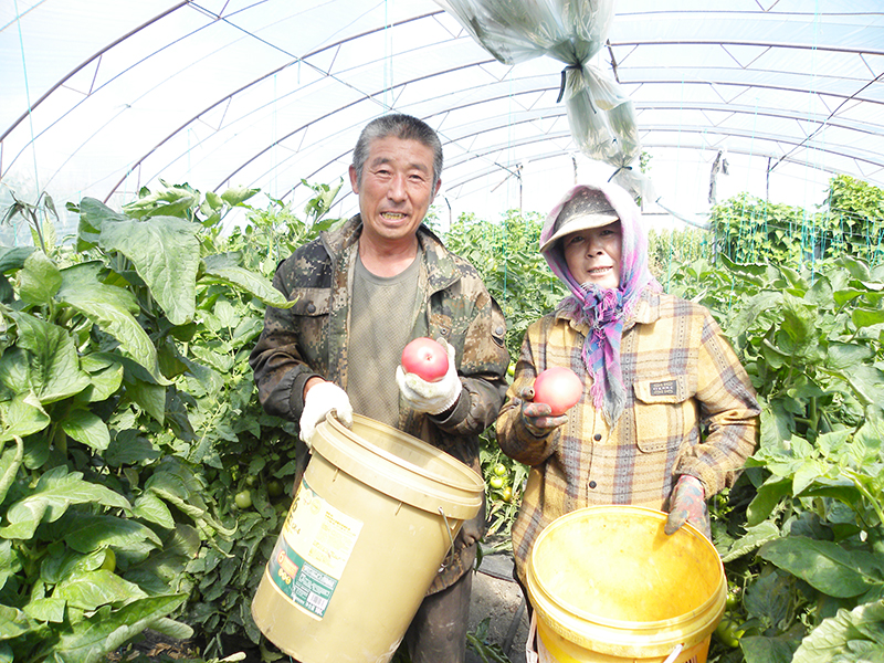 图为王宝忠和爱人在棚室里采摘西红柿。 张雅杰 摄