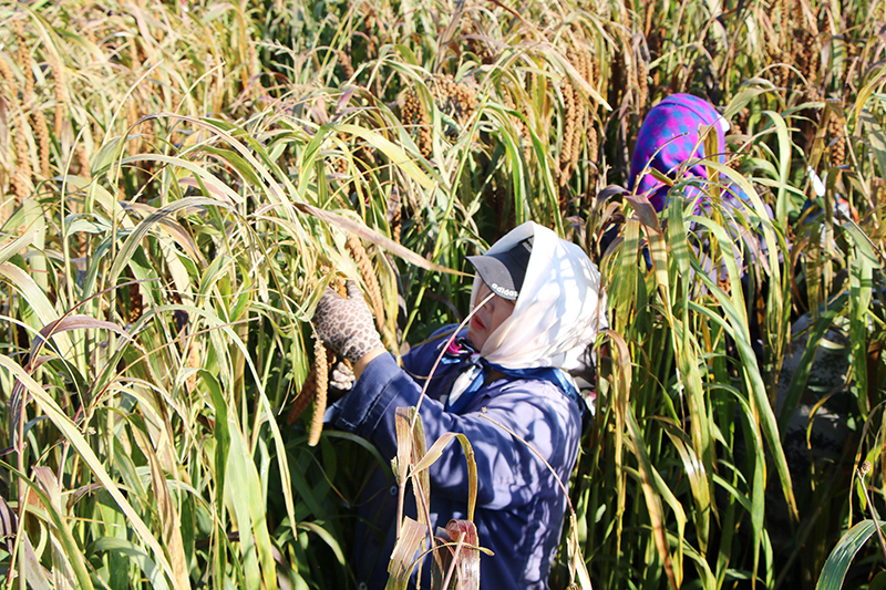 “看这长势,今年又是个好年景!”合作社成员郭亚芝大婶边挥镰边笑着说。汗水浸湿了她的衣襟,却掩不住眼中的自豪。作为当地特色农产品,裕村香红谷小米以其独特的营养价值和有机认证,不仅在国内市场广受欢迎,更远销海外,成为农民增收的“金钥匙”。