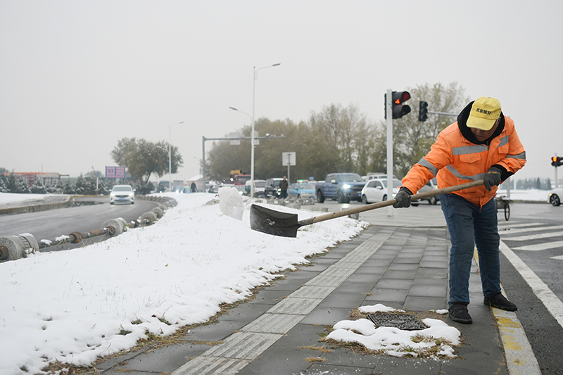 10月15日,在黑龙江省绥化市北林区,环卫工人清理路边积雪。
