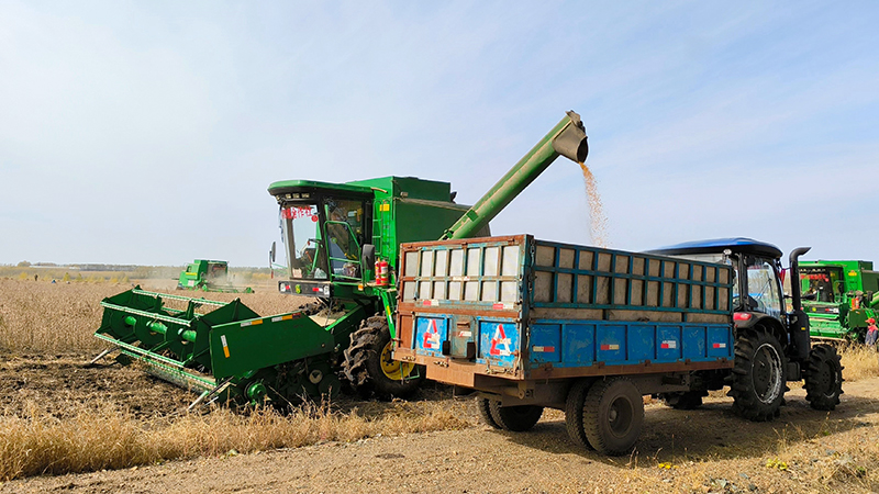 “现在每天作业量都在1000亩以上。村里推进土地托管,把过去零散的‘碎块地’整合连片,秋收效率一下就提上来了!”克音河乡向荣村的大豆田里,村干部钟果干劲十足。田间,6台大马力联合收割机全速运转,锋利的割台精准切割豆荚,脱粒后的金黄大豆顺着输粮管道涌入装粮车,每一粒“金豆子”都稳稳奔向“粮仓”。