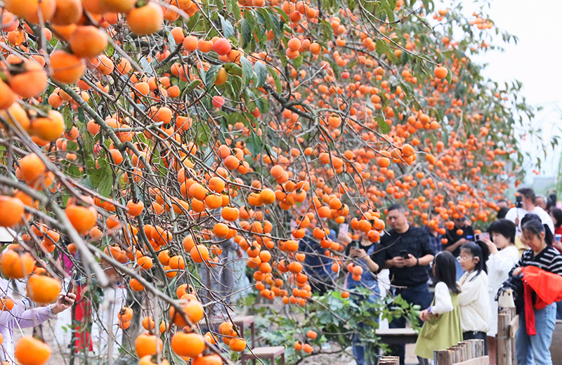 10月19日,市民和游客在四川省乐山市五通桥区汤家坝村观赏柿子树。