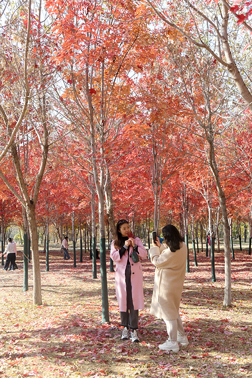 金秋时节,唯实公园的枫叶红了,为深秋的城市增添了一抹亮色,市民们纷纷走进公园,用手机记录下这美丽的秋色。