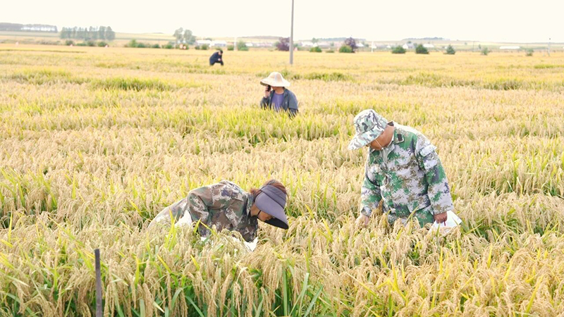 与此同时,在北方绿洲稻作研究所良种繁育基地的展示田,种植户李海军和张军正在认真比对稻种长势情况,为来年选种做准备。今年企业制种面积达5万亩,培育的“龙庆稻100号、龙庆稻118号”等优质品种以其产量高、抗倒伏的特性深受农户青睐。