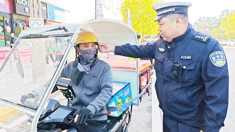 行动中,民警辅警在城区电动车、摩托车通行集中路段,对摩托车、电动车逐辆进行检查,对未正确佩戴安全头盔的骑乘人员,现场讲解正确佩戴头盔的方法及佩戴头盔的重要性和必要性。对未佩戴安全头盔的骑乘人员进行教育、警告。并当面宣讲交通安全法律法规等安全知识,详细剖析驾乘电动车、摩托车不佩戴安全头盔的严重危害和后果。针对外卖、快递等配送人员,民警辅警在街头逐一检查车辆运行手续和安全性能、头盔是否符合国家标准等情况,明确要求快递配送人员必须发挥重点行业示范引领作用,时刻戴好安全头盔,遵守交通法规,做好交通安全的带头人。