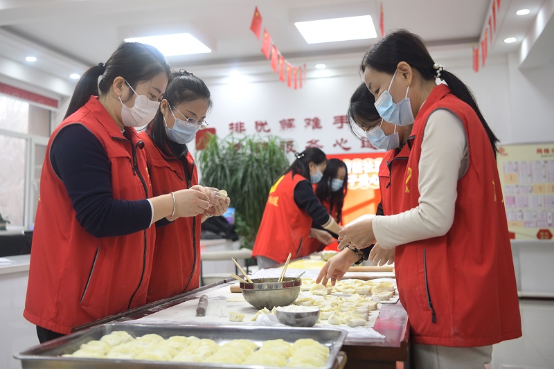 12月19日,北林区康庄街道府前社区组织社区工作人员和志愿者为辖区老年人包饺子。