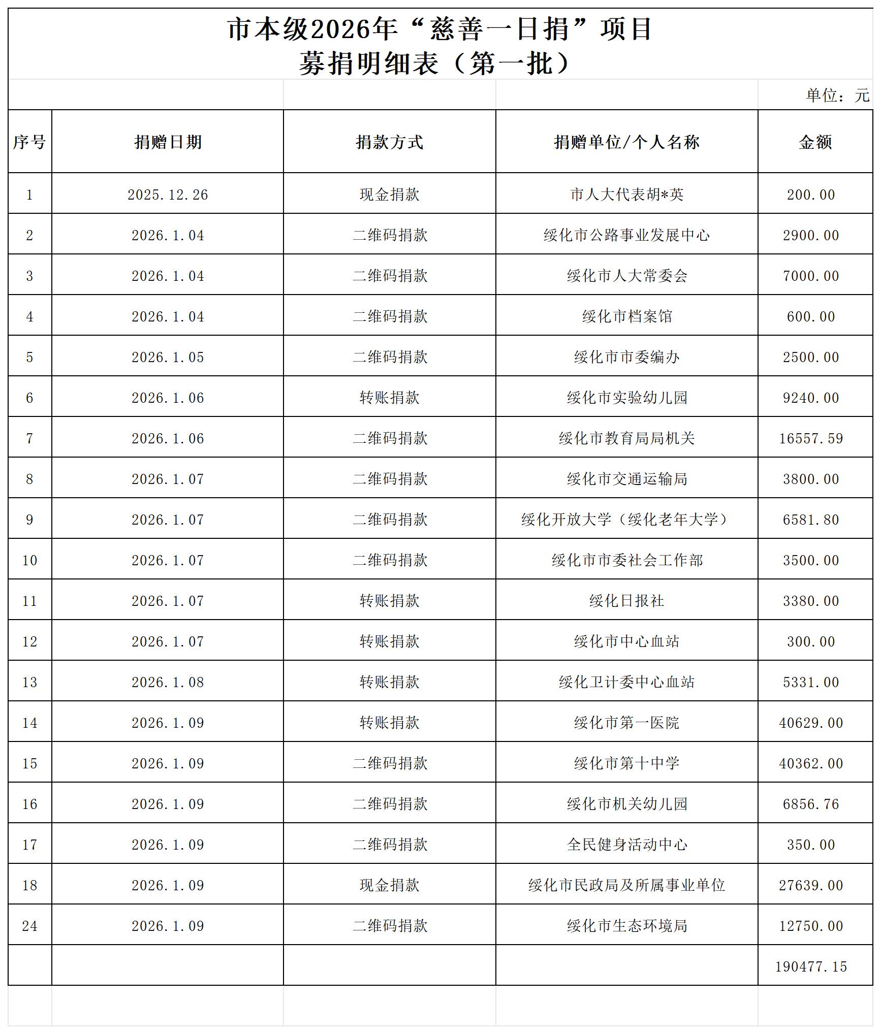 2025年12月26日至2026年1月11日,绥化市慈善联合总会接收绥化市本级“慈善一日捐”捐赠款190477.15元。捐赠的善款将用于慈善助老、助医、助学、助困等。现将捐款名单公告如下: