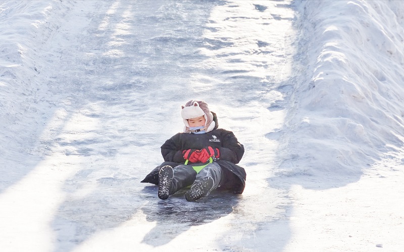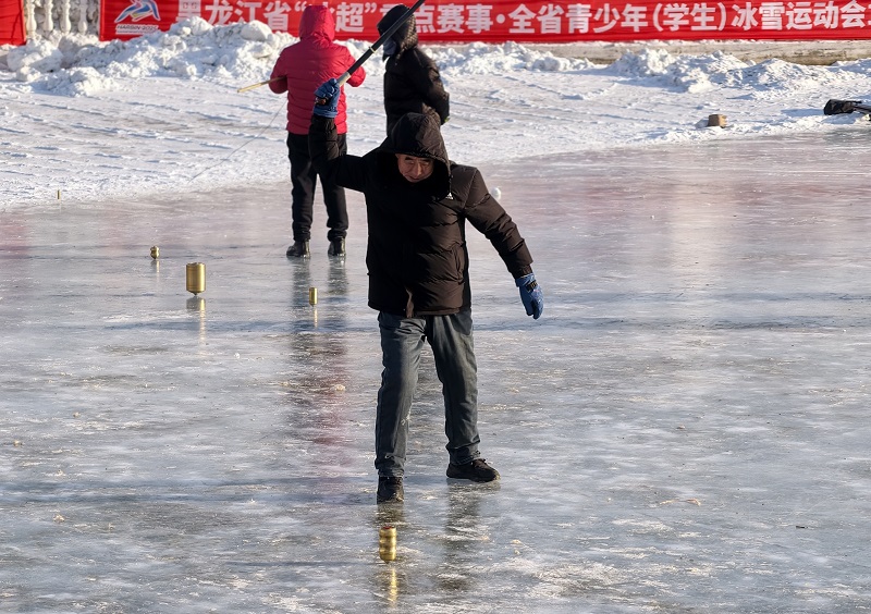 户外冰雪乐园里热闹非凡,孩子们坐着冰滑梯尽情欢笑,冰面上有人挥杆抽冰尜、踩着冰车穿梭,还有滑冰爱好者在冰面竞速,身姿矫健。