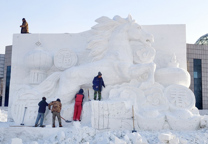 在市区冰雪景观打造现场,工匠们正精雕细琢马年主题雪雕,奔马造型栩栩如生,福字、灯笼等新春元素点缀其间,每一刀都尽显匠心。