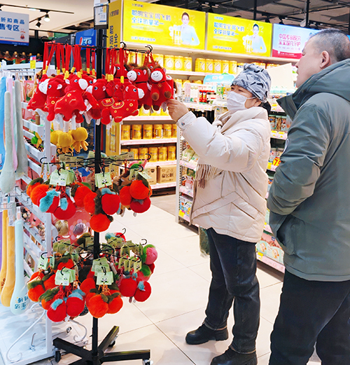 在商超的年货专区,货架上整齐摆放着各式各样的生肖马玩偶,红金配色的毛绒小马造型憨态可掬,既有昂首扬蹄的立体摆件,也有小巧可爱的挂饰款,价格从三十余元到上百元不等,丰富的款式满足了消费者的不同选购需求。不少市民专程前来挑选生肖玩偶,有的拿起挂件细细端详,有的对比不同造型的摆件,为家中增添新年氛围,生肖马玩偶的热销也让年味愈发浓郁。