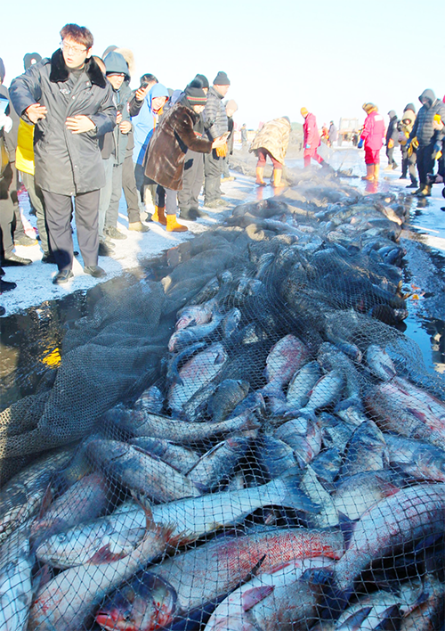 随着“鱼把头”一声嘹亮的号子,拉网腾鱼环节震撼启幕,捕鱼汉子们默契配合,将百米大网从冰洞徐徐拉出。须臾之间,头鱼跃水而出,银鳞闪烁,瞬间点燃全场热情。游客们纷纷围拢拍照,定格“冰湖腾鱼”的壮观景象,欢呼声、惊叹声此起彼伏,为冬日的冰湖增添无限生机,也让在场观众在收获与好运的象征中,感受年年有余、福气满盈的新春祝福与浓浓年味。