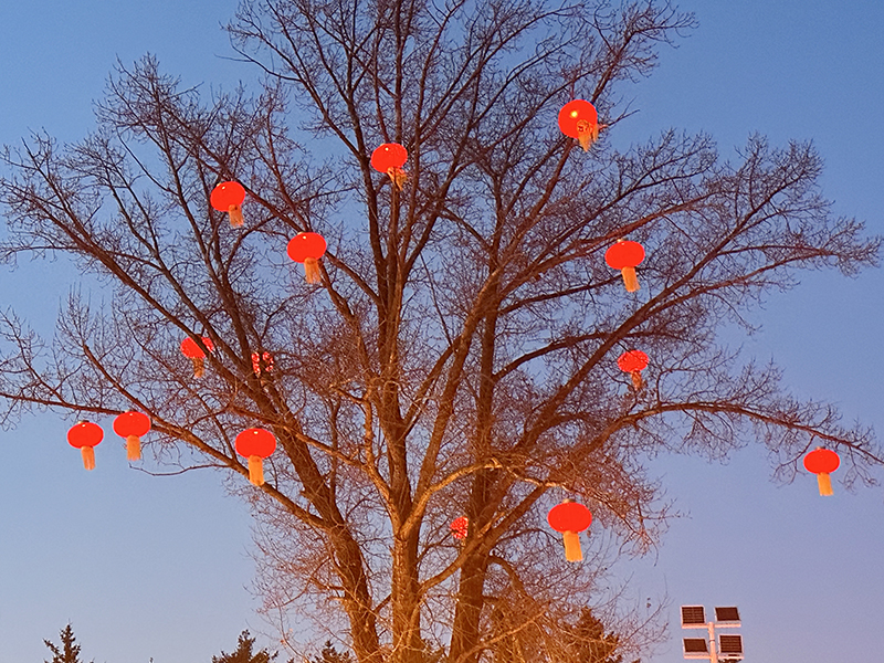 沿着灯笼长廊往里走,政府大院门前的景观更令人沉醉。数十棵松树错落有致,树干被缠绕的黄色彩灯勾勒出挺拔的轮廓,暖黄色的光线温柔地包裹着墨绿色的枝干,在夜色中显得格外雅致;树冠上则缀满了密密麻麻的红色小灯笼,最小的仅拳头大小,最大的也不过巴掌宽,这些小灯笼或成串悬挂,或单独点缀,与松针相映成趣。微风拂过,红灯笼轻轻晃动,黄色彩灯明暗交替,仿佛繁星坠落林间,既有“火树银花”的壮阔,又不失“松枝挂彩”的精巧。
