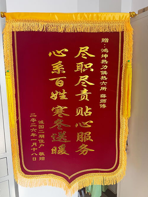 “心系百姓寒冬送暖,尽职尽责贴心服务。”诚园二期居民代表送给运行六所维修工薛兆旺的锦旗,见证用户的认可。“今冬家里温度不达标,薛师傅来来回回跑了十余次,清洗、排气、调阀,还多次回访,直到温度稳定,这种负责态度太让人感动了!”居民代表李女士道出送旗缘由。