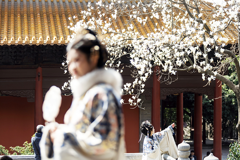 3月7日,身着古装的游客在江苏省南京市朝天宫景区与玉兰花合影。 新华社发 (