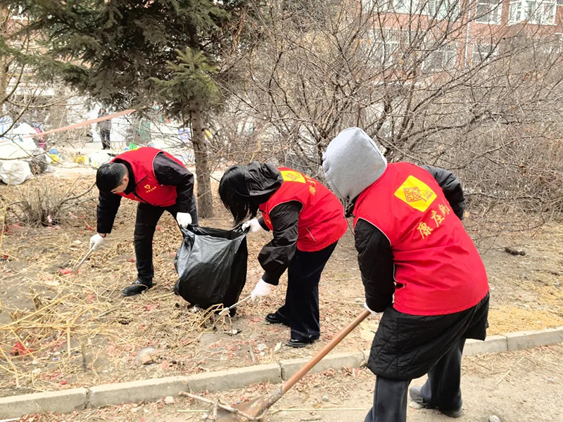 在室外公共区域,工作人员同步开展环境清洁行动。大家手持垃圾夹、铁锹、垃圾袋等工具,对辖区绿地、绿化带内的白色垃圾、枯枝落叶、砖石杂物以及卫生死角进行全面清扫捡拾。工作人员分工协作、认真细致,不放过一处角落、不留下一片垃圾,让冰雪初融的绿地恢复整洁,社区居住环境更加清新宜人。