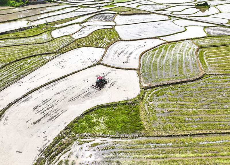 4月5日,湖南省永州市双牌县泷泊镇农民驾驶农机在翻耕农田(无人机照片)。