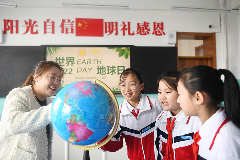 图①4月21日,绥化市北林区雷锋小学的教师为学生讲解世界地球日相关知识。