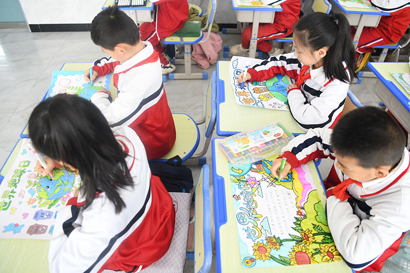 图③4月21日,绥化市北林区雷锋小学的学生们在绘画世界地球日的手抄报。